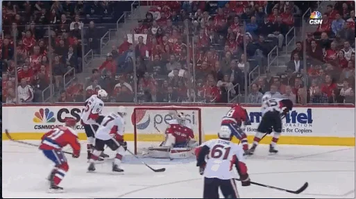 The Senators are on the tail end of a 5-minute major power play, having just scored their first goal of the game on a deflection by Bobby Ryan. Mike Hoffman shoots from the center left blue line, and the puck goes wide to Holtby’s right.